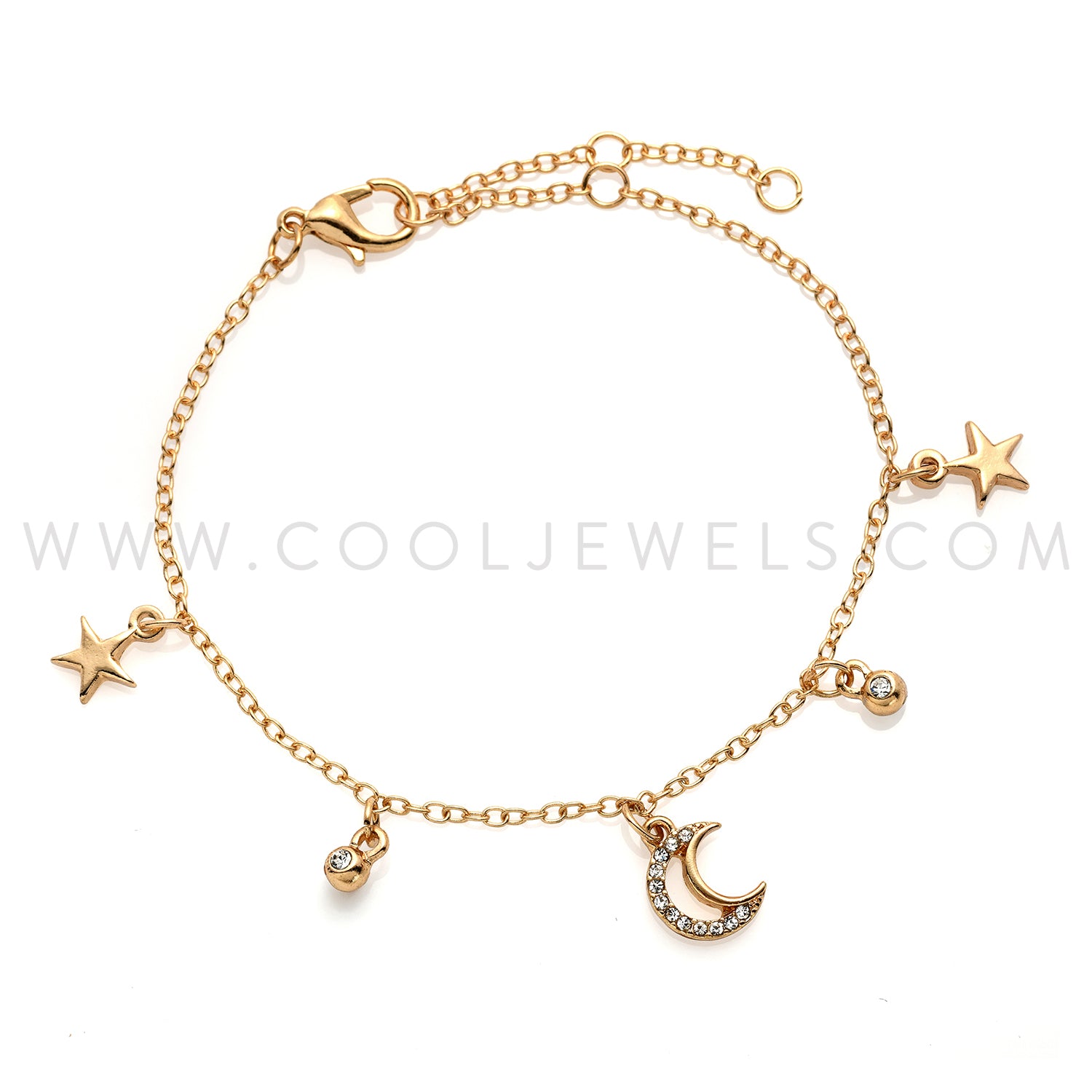 GOLD LINK CHAIN BRACELET WITH RHINESTONE MOON & STAR PENDANTS