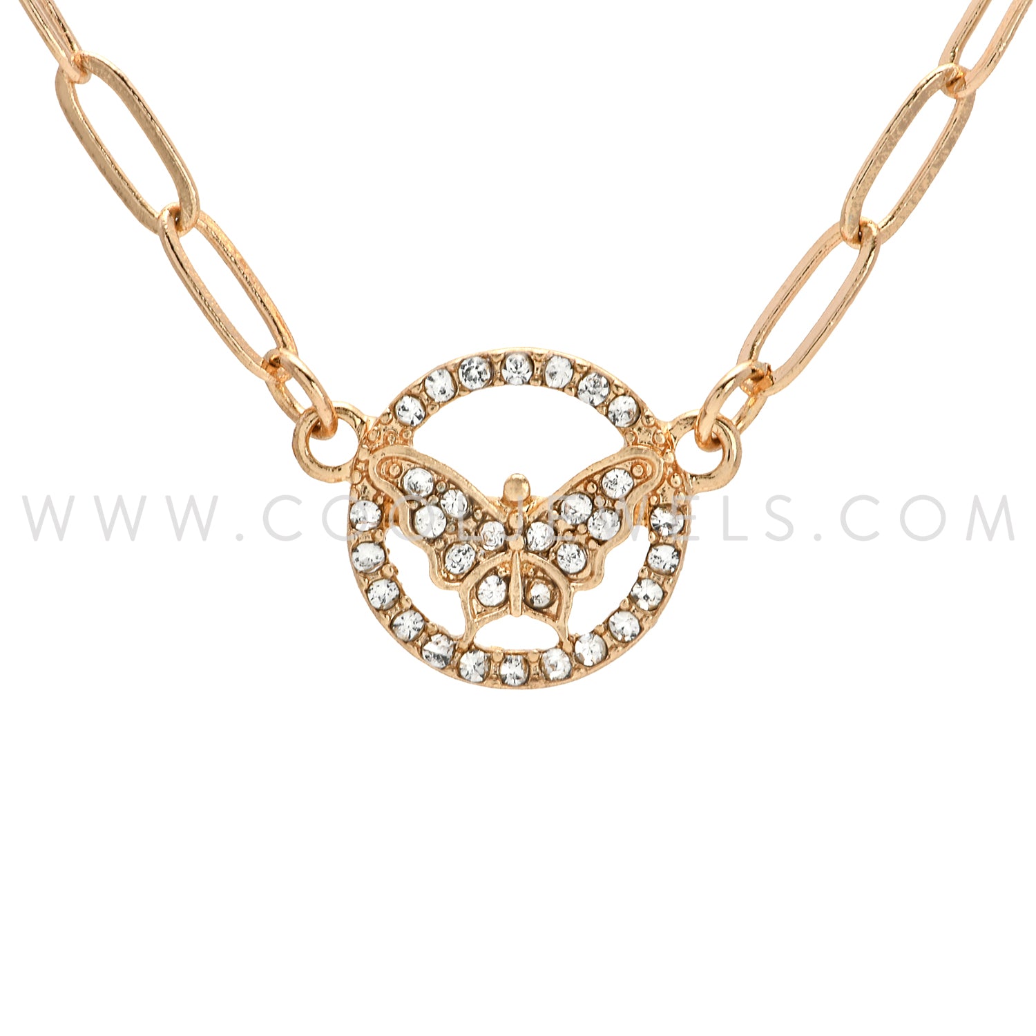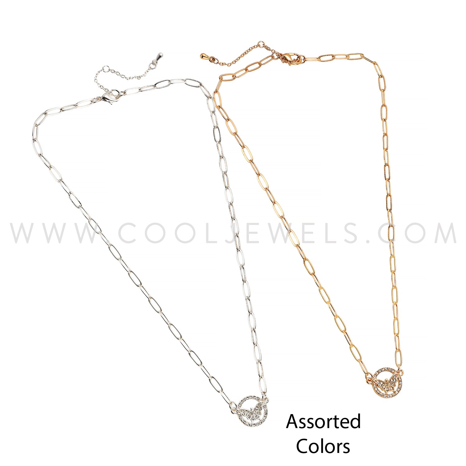 LINK CHAIN NECKLACE WITH ROUND RHINESTONE BUTTERFLY PENDANT ASSORTED - CARDED