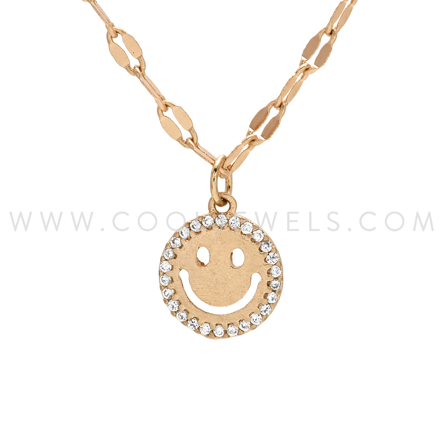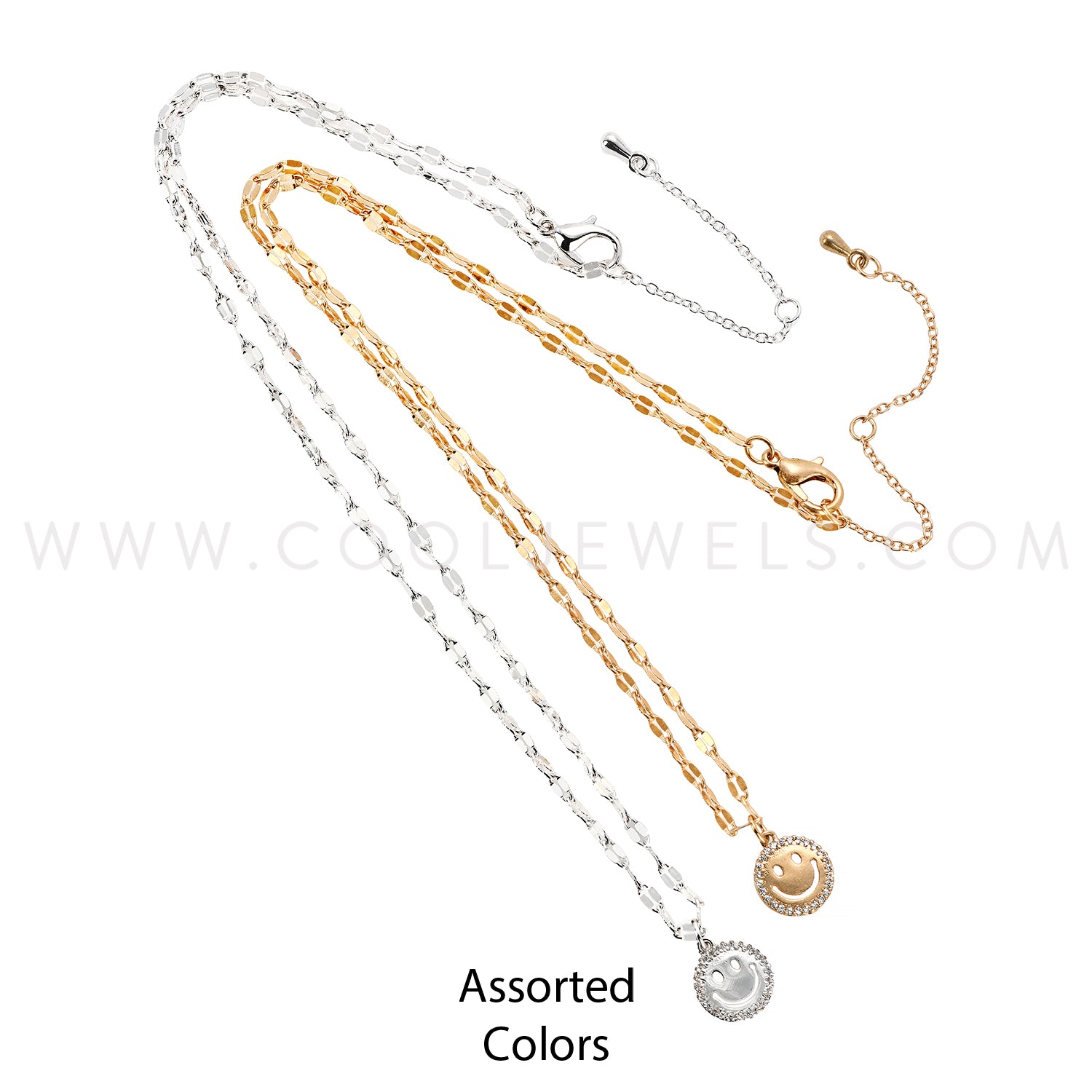 LINK CHAIN NECKLACE WITH ROUND RHINESTONE HAPPY FACE PENDANT ASSORTED - CARDED