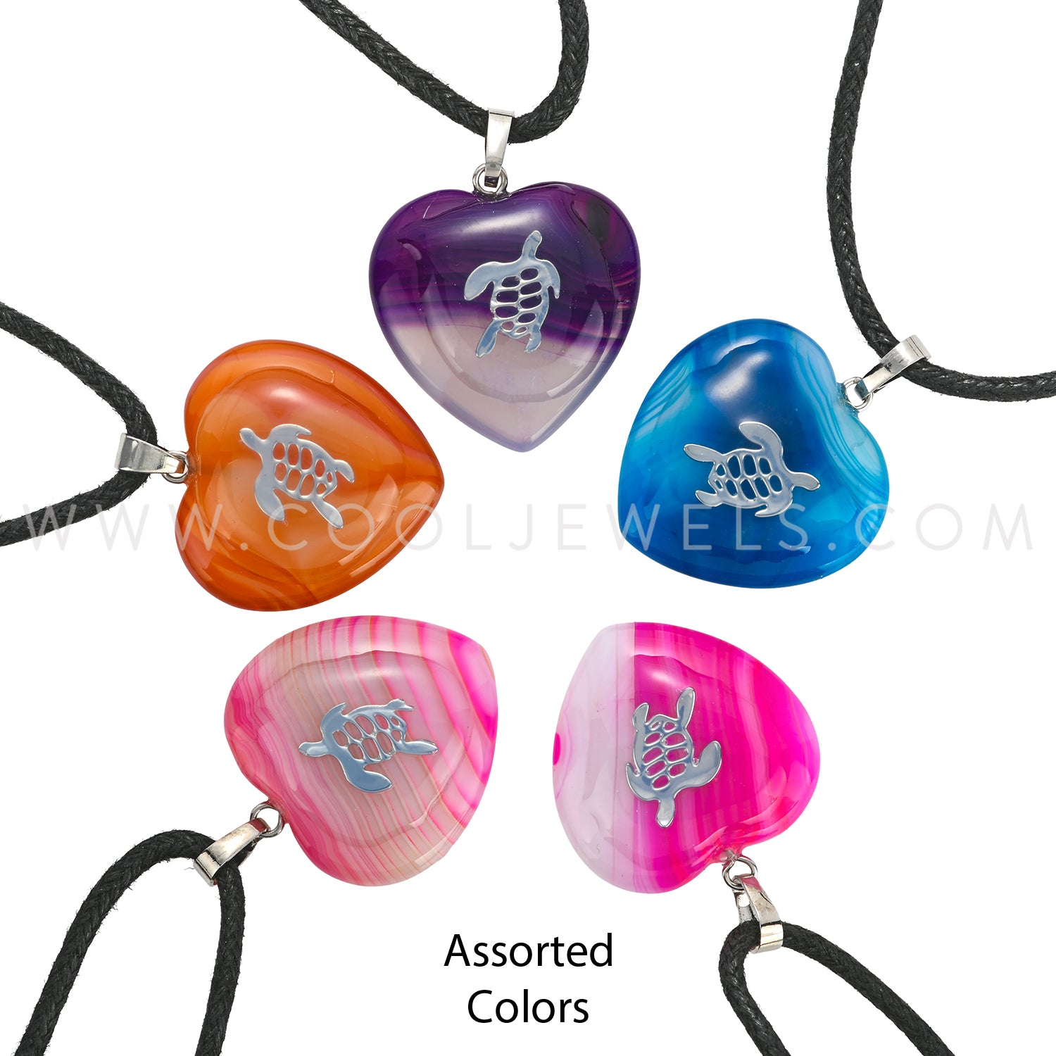 These Assorted Cool Jewels® Elements® by Candace Lauren® Sea Turtle Genuine Stone Necklaces features a genuine precious stone with a silver sea turtle pendant on a black cord necklace.Each dozen comes with a variety of shapes and colored stones.
