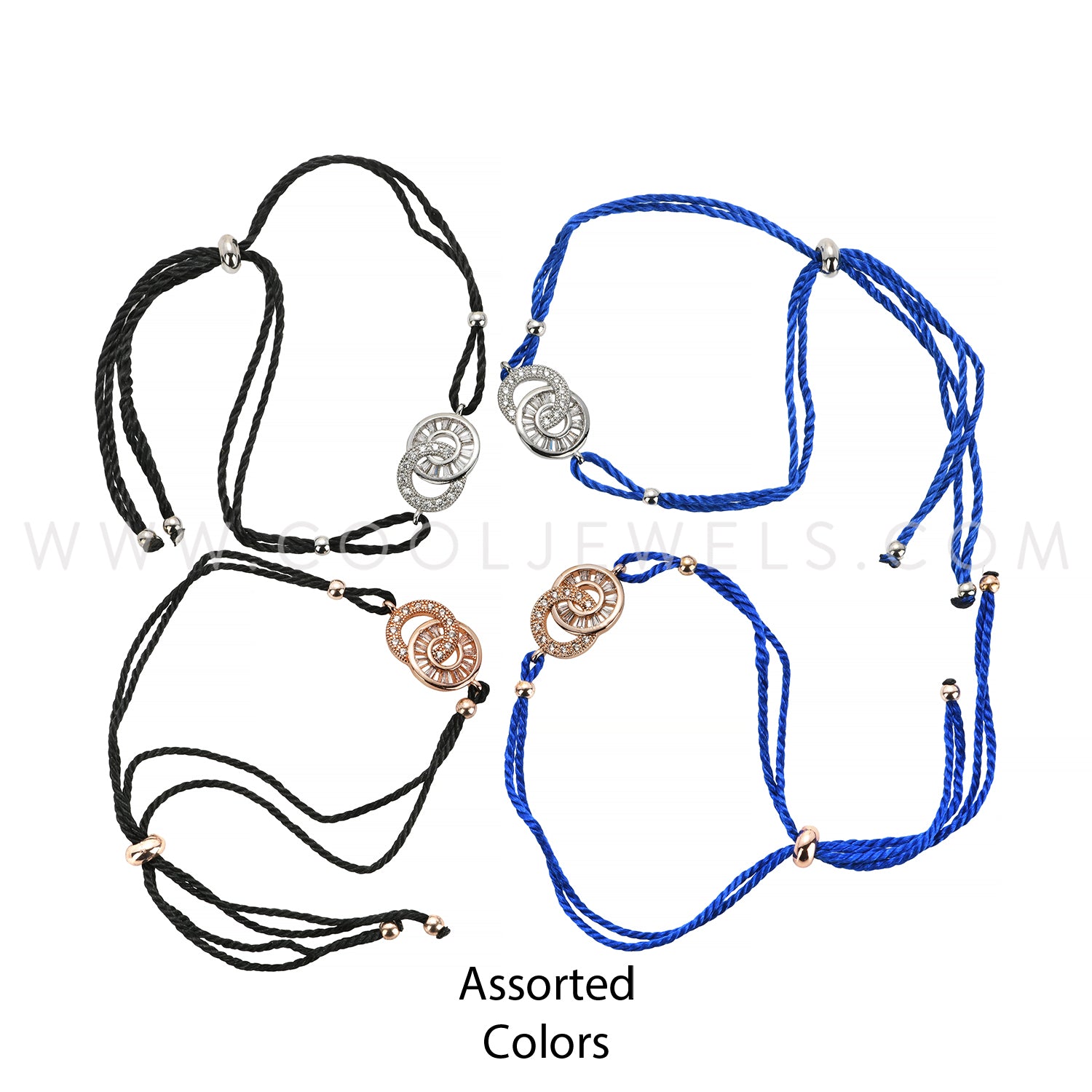 These Assorted Rose Gold & Silver Cool Jewels® Elements by Candace Lauren® Rhinestone Circle Bracelet features a rose gold or silver rhinestone circle pendants on a blue or black cord bracelet.Fashion Bracelet comes in premium Elements packaging.