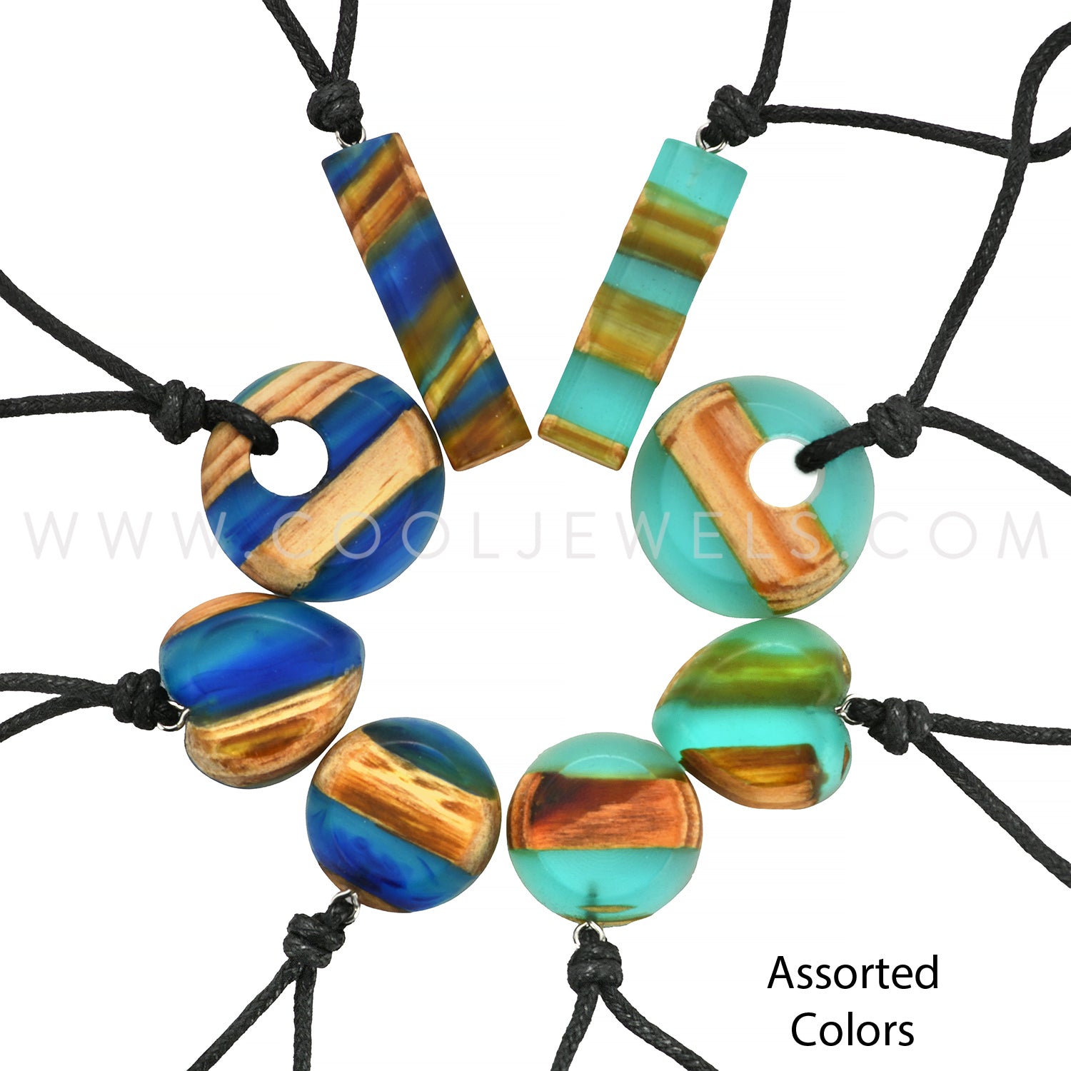 These Assorted Round, Heart, & Cylinder Cool Jewels® Elements by Candace Lauren® Acrylic & Wood Pendant Necklaces features a blue acrylic and natural wood pendant that comes in a variety of shapes on a black slider cord necklace.Fashion Pendant comes in premium Elements packaging.