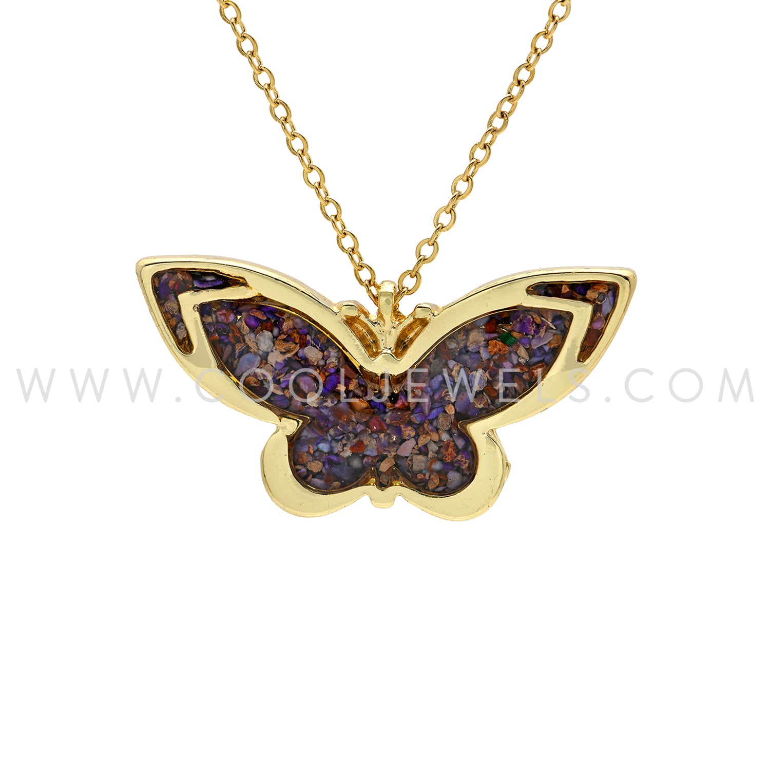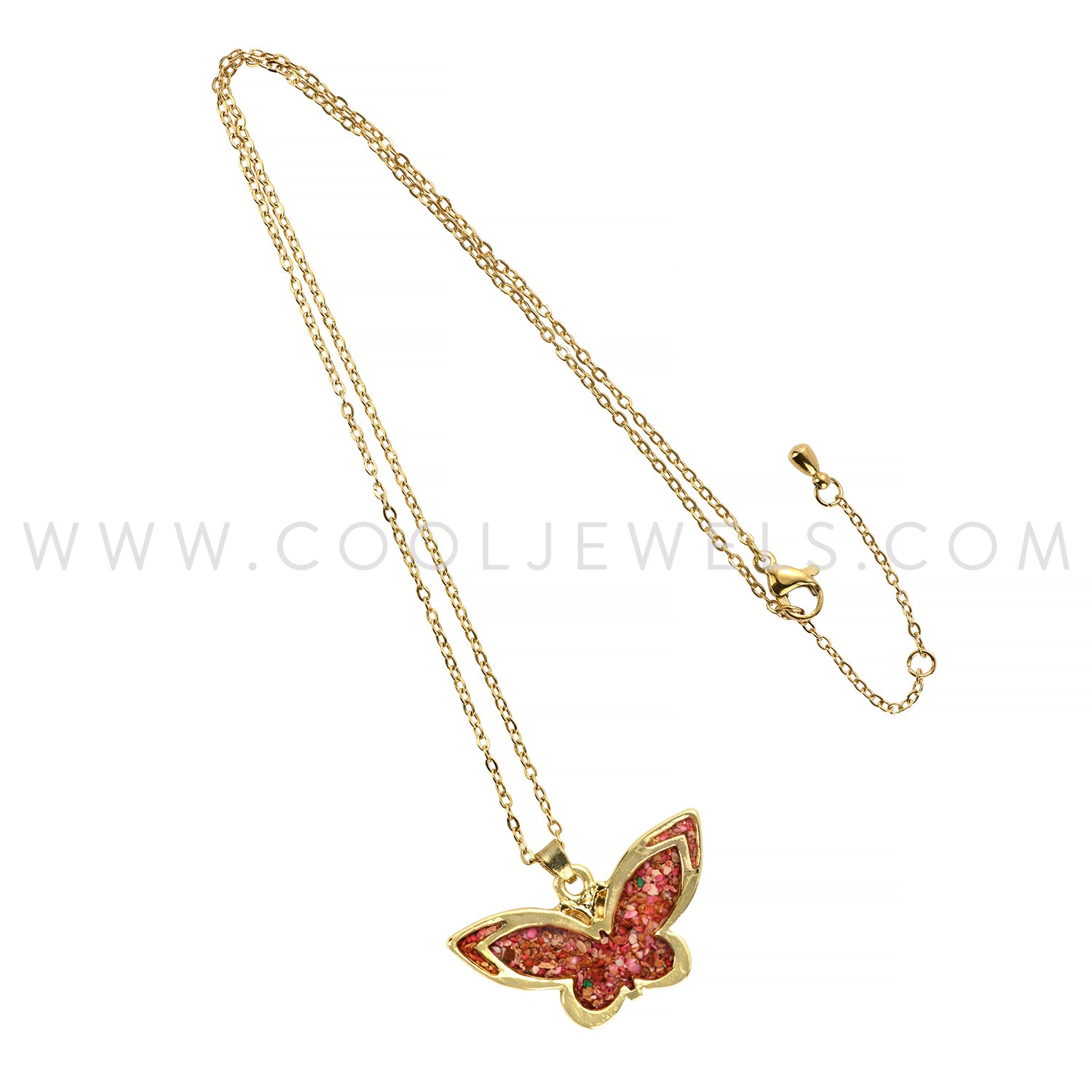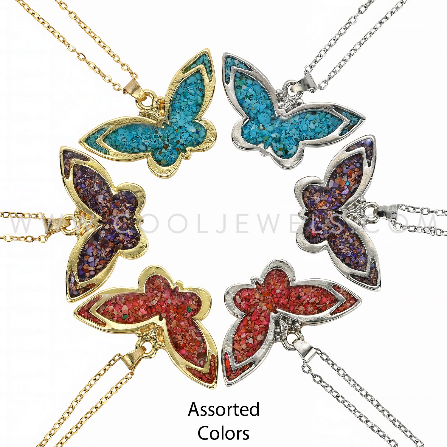 LINK CHAIN NECKLACE WITH CRUSHED STONE BUTTERFLY PENDANT ASSORTED - CARDED