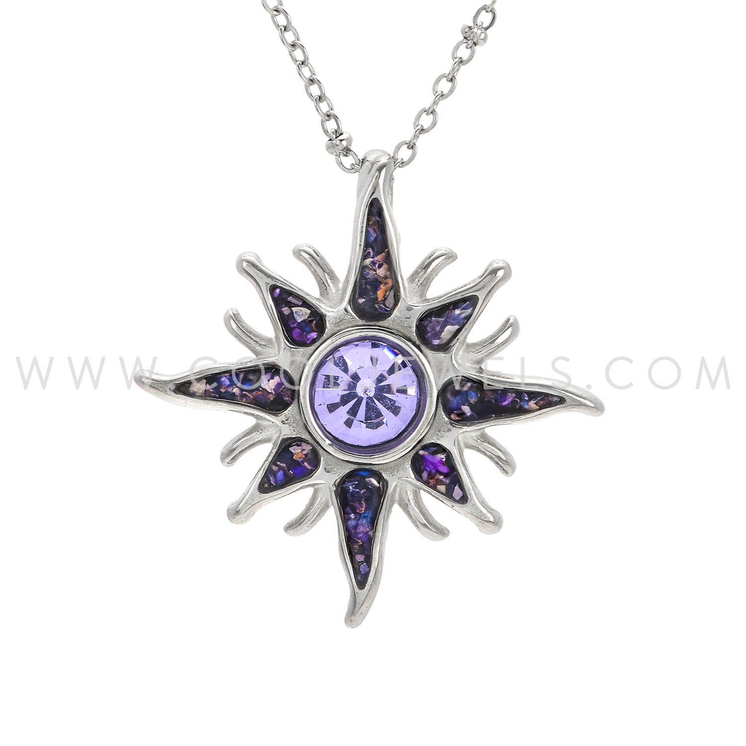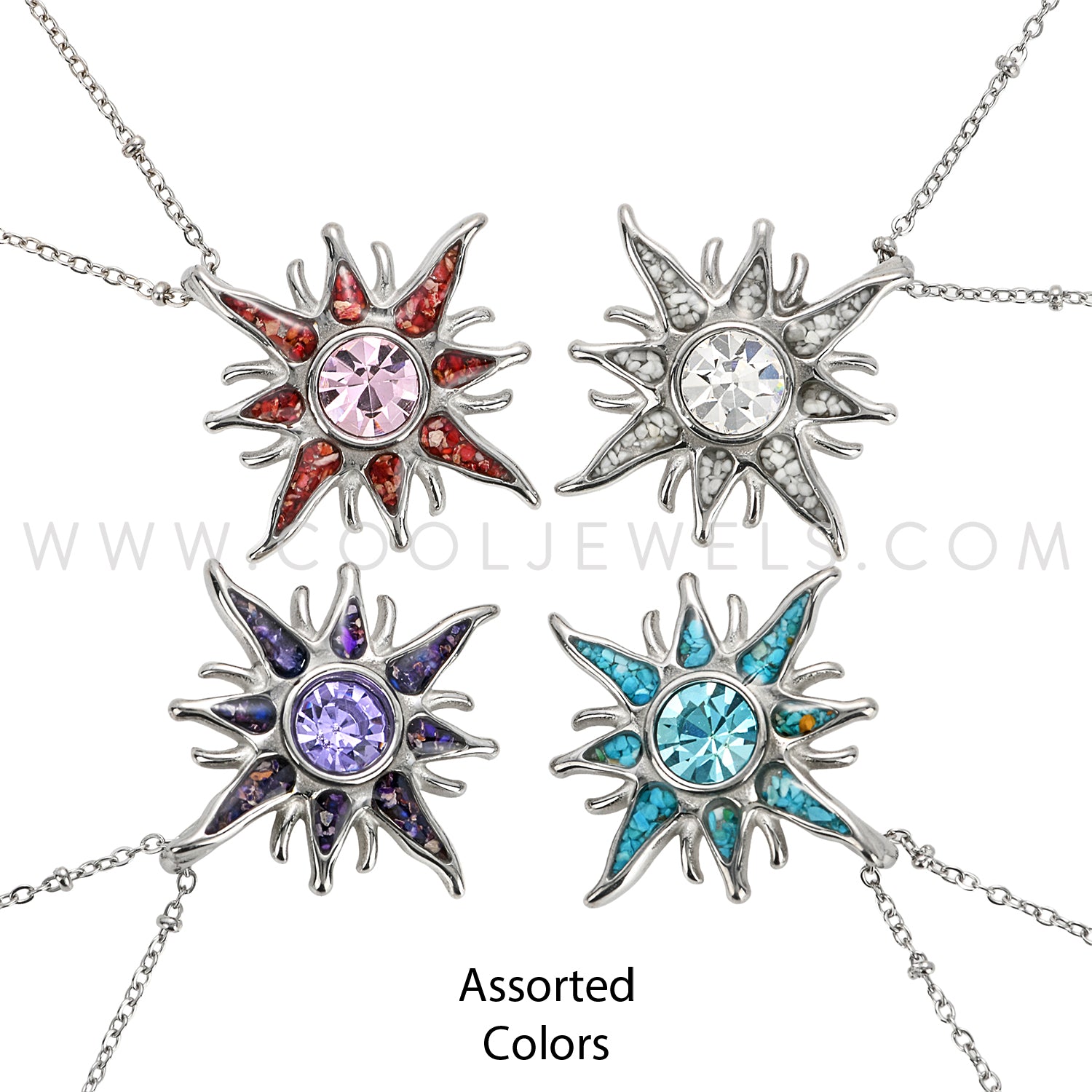 STAINLESS STEEL CHAIN NECKLACE WITH CRUSHED STONE STAINLESS STEEL SUN PENDANT CARDED - ASSORTED