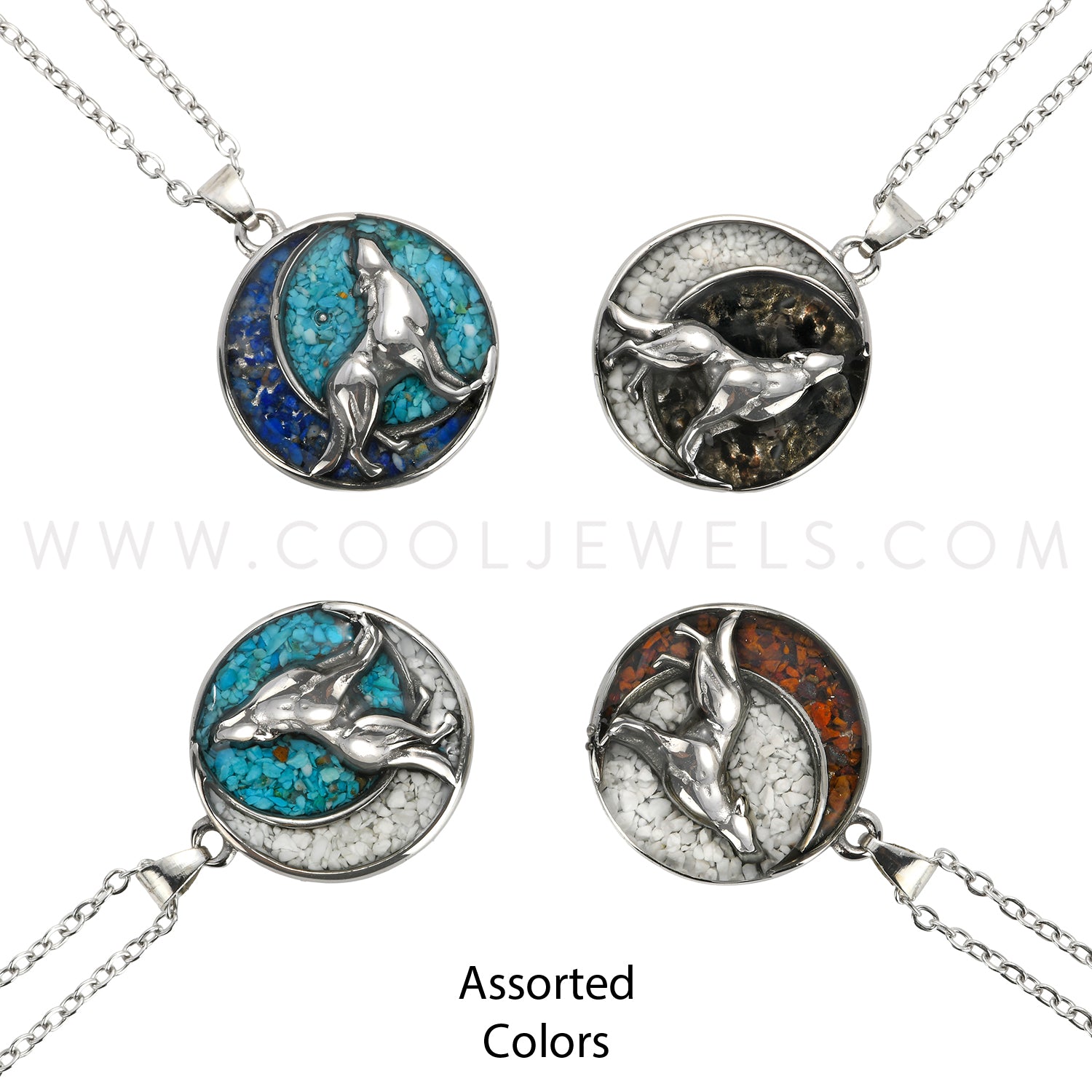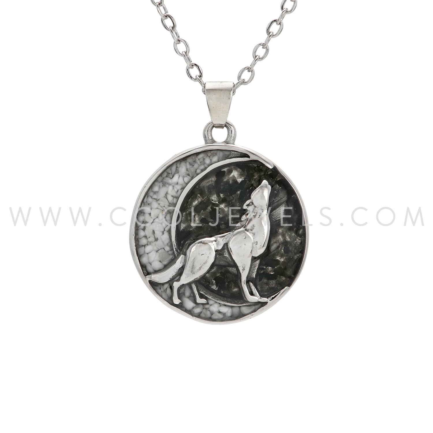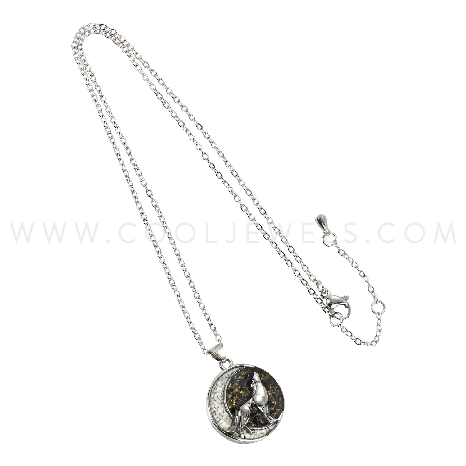 STAINLESS STEEL CHAIN NECKLACE WITH CRUSHED STONE STAINLESS STEEL ROUND PENDANT WITH WOLF CARDED - ASSORTED
