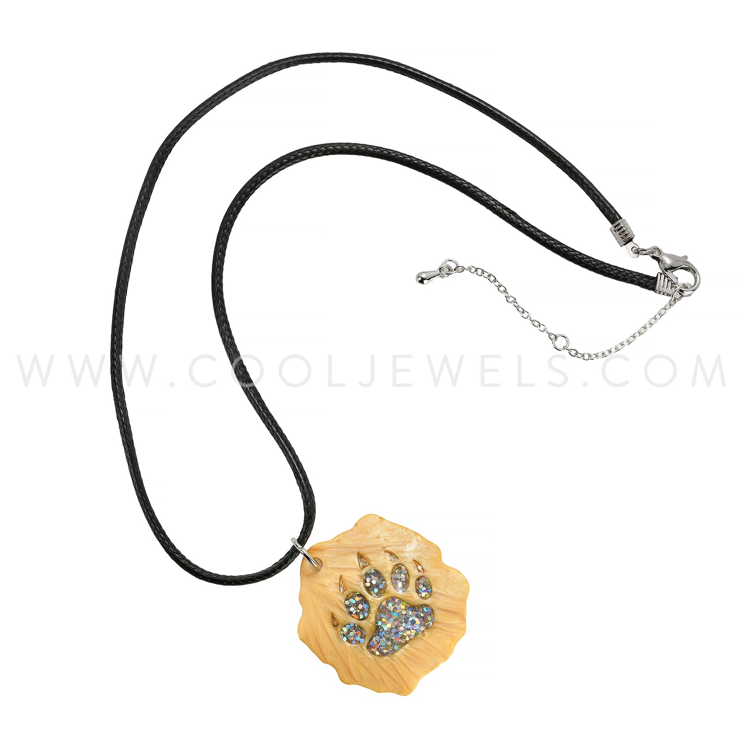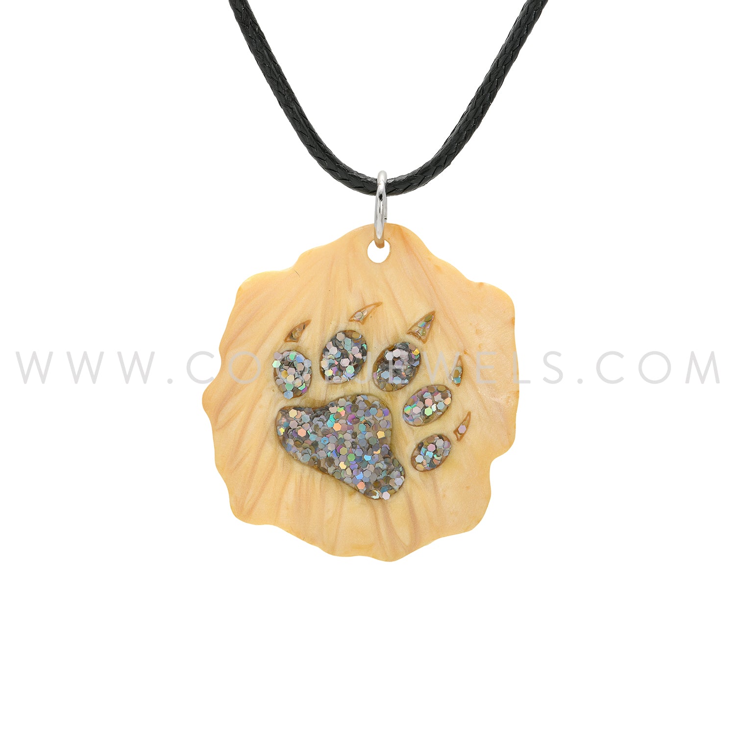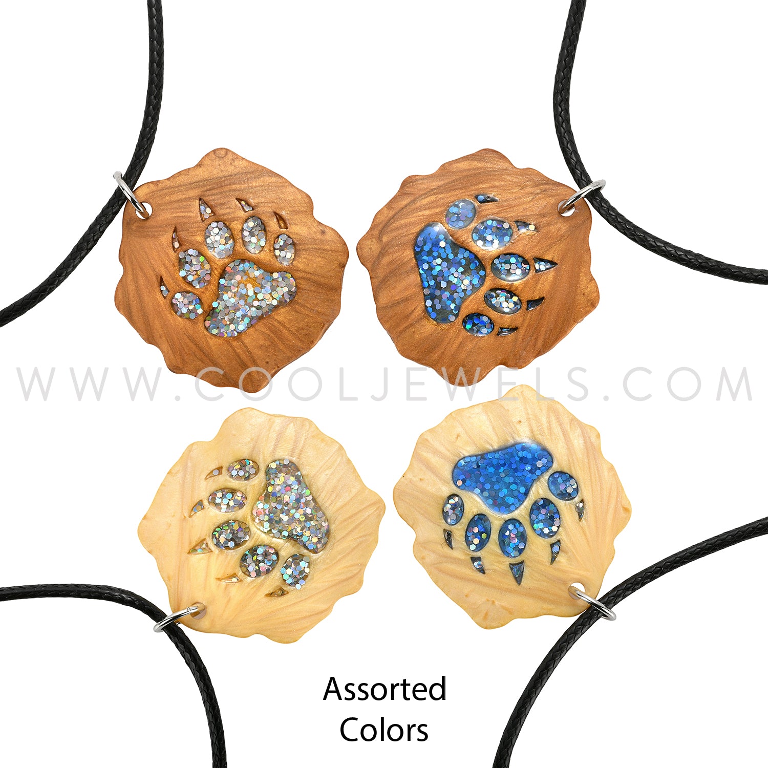 BLACK CORD NECKLACE WITH FAUX WOOD PENDANT WITH COLORED BEAR PAW ASSORTED - CARDED