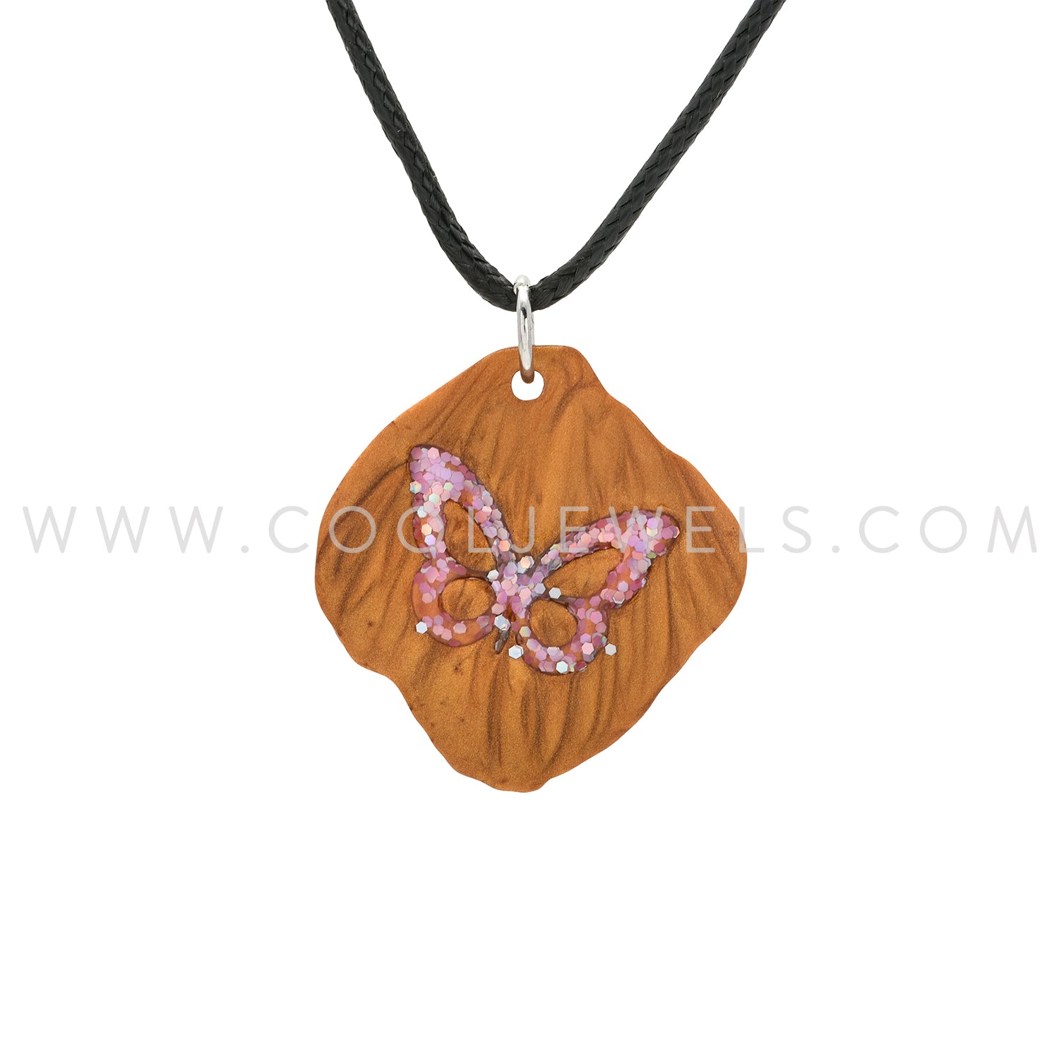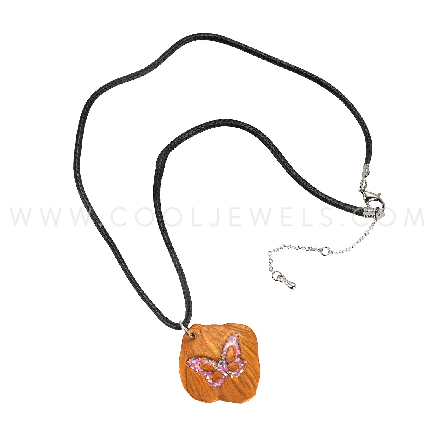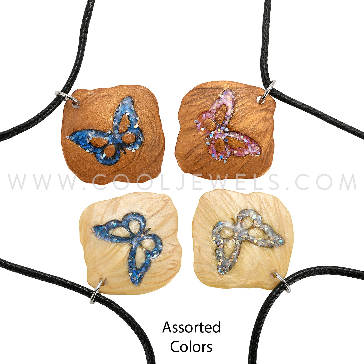 BLACK CORD NECKLACE WITH FAUX WOOD PENDANT WITH COLORED BUTTERFLY ASSORTED - CARDED