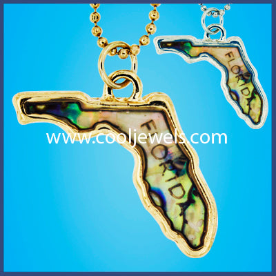 These Assorted silver and gold Florida Pendant Diamond Cut Ball Chain Necklaces features the state of Florida paua pendant suspended on a diamond cut ball chain necklace.