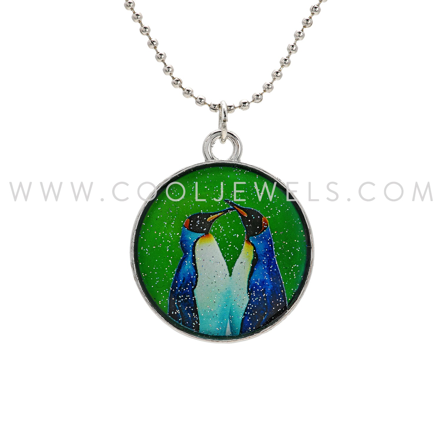 These Round Glitter Mood Penguin Pendant Necklaces feature a round glitter color changing mood penguin pendant suspended on a silver ball chain necklace.