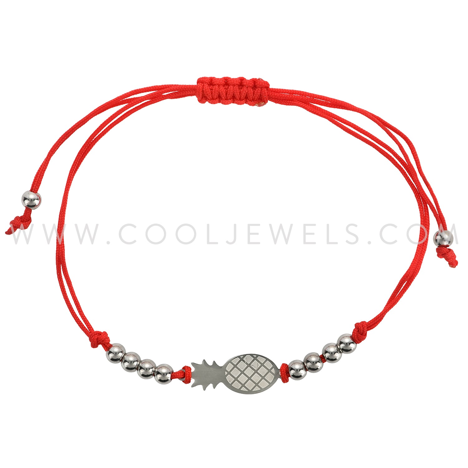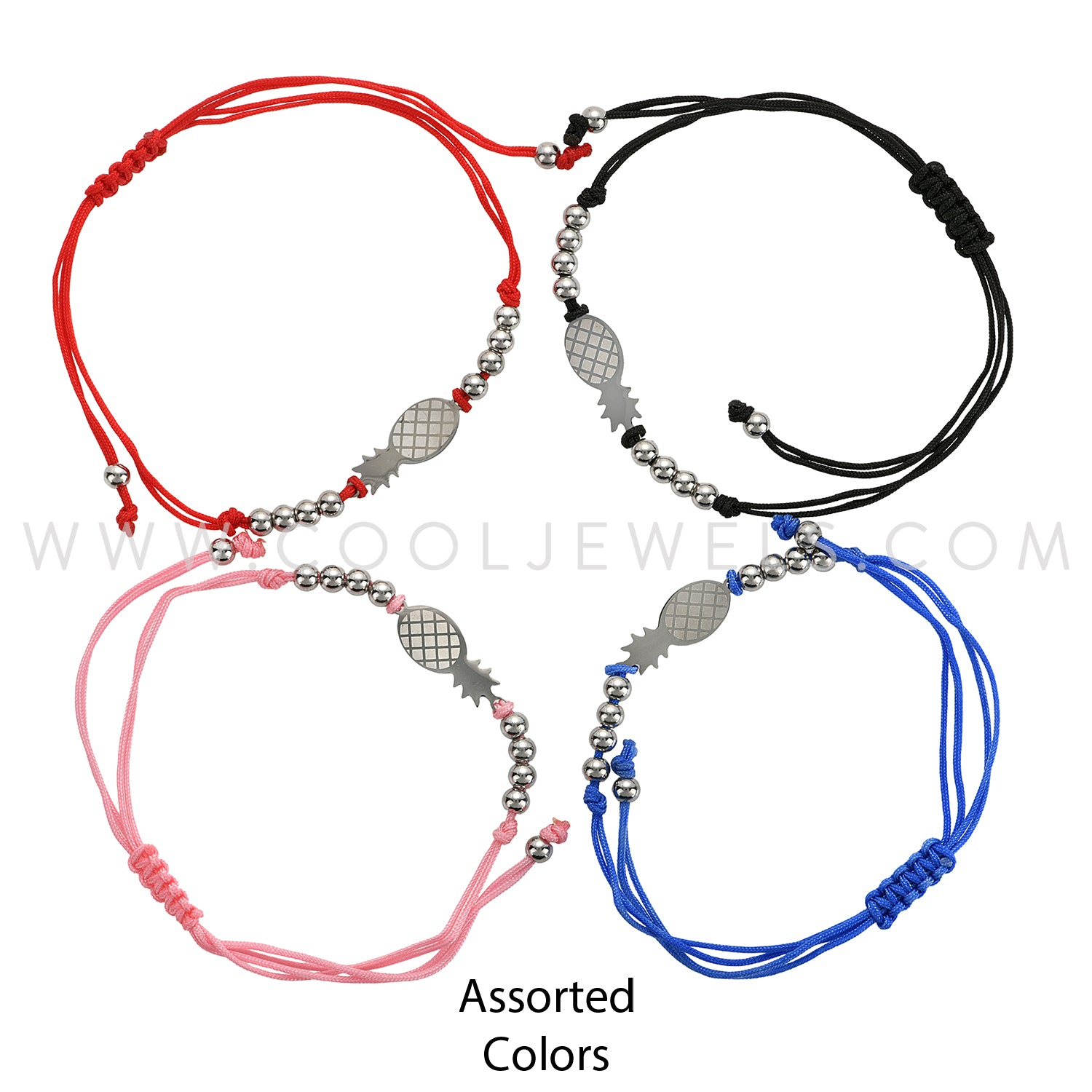 These Assorted Black, Red, Blue & Pink Silver Pineapple & Beads Anklet/Bracelet features a silver laser cut out pineapple with accent silver beads on a colored slider anklet / bracelet.